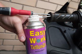 Tämän jälkeen alkaa kahvatupin irroittaminen. Kahvatuppi on yleensä liimattu tankoon kiinni. Irroittaminen on suhteellisen helppoa. Työnnät tangon päädystä kahvatupin ja metallisen tangon väliin ohuen lattapäisen ruuvimeisselin. Venytät kahvakumia pikkuisen ja ruiskaset sisään pikkuisen jotain rasvaa. Ihan vaikka polkupyörän ketjurasvaa tai mitä nyt sattuu hyllystä löytymään. Tämän jälkeen ruuvimeisselillä vielä työnnät muutamista eri kohdista kahvakumin ja tangon välistä koko matkan, että kumin liima irtoilee eri kohdista. Sitten varovasti kahvakumista vääntelet edes takaisin ja pikkuhiljaa huomaat miten kumi alkaa irtoaamaan. Ja saat lopulta kahvakumin vedettyä irti tangosta nätisti.