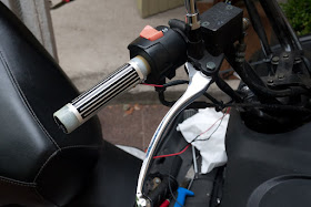 Tämän jälkeen siirrytään kaasukahvalle. Kaasukahvan puolella täytyy muistaa sama juttu että elementtiä ei ihan kiinni nappuloihin asti. Johtoa täytyy jäädä kumikahvan sisään. Kaasukahvaa pyörittäessä on suurempi riski että johto nitkuttaa itsensä poikki liitoskohdasta. Johtoa täytyy myös muistaa jättää sopivan löysästi, että se elää kaasua käännettäessä. Eikä johto myöskään saa hiertää mihinkään tai aikaa myöten se kuluu läpi ja aiheuttaa oikosulun.