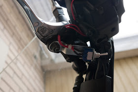 Vasemman puolen elementin mukana oli noin 10cm johdot joihin oli liitetty katkaisija lämmitykselle. Katkaisijalle löytyikin sopiva paikka vasemman kahvan alapuolelta. Ei ole tiellä ajossa ja kuitenkin helposti yletyttävissä ajossa. Myöskin suoralta sateelta hieman suojassa.