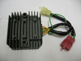 Kolmannessa mallissa on 6 johtoa ja samat liittimet kuin alkuperäisessä. Mutta vihreää maajohtoa ei ollekaan. Vain 3 plus ulostuloa (punainen, musta, valkoinen). Tämmöinen regulaattori ilmeisesti hoitaa maadoituksen regulaattorin rungon (jäähdytyssiilin) kautta, mistä se pultilla ruuvataa runkoon kiinni. Tästä en kylläkään ole varma, mutta muistaisin näin lukeneeni jostain???
