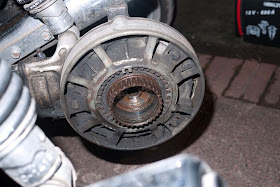 Ensin piti nirhata ruuvimeisselillä tuo prikka poikki. Muulla konstin ei oikein saanut. Sitten dreemelillä pultin pää katki. Jonka jälkeen tuurnalla hakkaamaan pulttia moottoria-kohti että sen saa ulos. Luojan kiitos siellä ei ollut kierteitä moottorin korvakkeissa eikä rungossa. Muuten olisi jäänyt siihen.