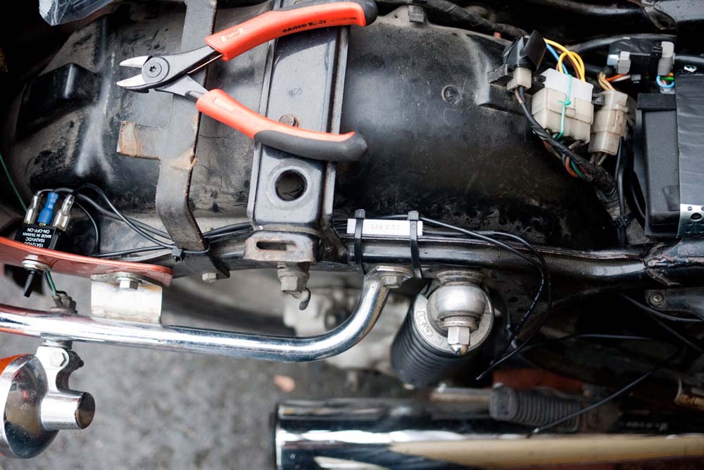Etupäässä kahvatupeille menee satulan alta vanha virtajohto, joka tulee nyt takapään katkaisijalta. Etupäässä olisi varmasti ollut jotain maadoituspaikkojakin. Mutta koska siellä on melkoinen johtohässäkkä ajovaloumpion takana, niin ajattelin vetäistä kokonaan uuden maajohdon. Tarvitsin hyvää maadoitusta kuitenkin myös tulevaa navigaattorin laturia varten. Jotenka tankki irti ja vasemman puolen sytytyspuolan mutteri irti ja sinne sopivaan väliin kunnon liittimellä johto. Mutteri takaisin ja kireälle. Hyvä maadoituspaikka eikä pääse liikkumaan saati kosketuksiin minkään kanssa. Tankkikin tulee suojaksi päälle takaisin.