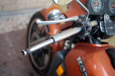 Nyppäsin vasemman kahvatupin irti ja ihmettelin että mikäs se siellä putken keskellä kurkistaa. Siellä oli joku ihme tanko. Taitaa olla ihan originaali tankopaino, joka on sisäänrakennettuna. Lähti ihan nyppäämällä nätisti irti. Piti irroittaa, koska tarkoitus on laittaa tangonpääpeilit ja sen vuoksi tangossa ei voi olla mitään tukkeena edessä.