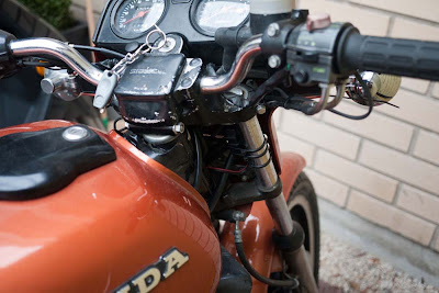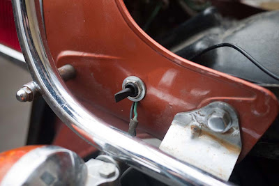Tosiaan katkaisijalle en meinannut löytää järjellistä paikkaa, jossa se olisi sateelta suojassa ja jottei se olisi liiaksi pilaamassa originaalia retroluukkia. Naapuri vanha moottoripyörän omistaja ja automekaanikko näki heti oivan paikan. Takapäässä vilkun johdoille on hyvä läpivienti katteessa. Juuri sopiva. Pienellä sahalla nitkutin kolosta noin 3mm alaspäin loven, johon sain johdot nätisti ja itse reikä jäi kokonaan katkaisijan käyttöön. Ison prikan kanssa se istui siihen täydellisesti. Ja katkaisija on vielä sellaista mallia että siihen saa kumipintaisen vedenpitävän päällysteen, ettei takapyörän kuratkaan lennä katkaisijalle hapettumisia tekemään. Aivan loistava paikka. Kiitokset naapurille vielä tästä hyvästä ideasta. Ei ihan heti itsellä olisi tullut mieli laittaa lämpökahvoille katkaisijaa takapäähän. Ja kuitenkin koeistumalla katkaisija on sellaisessa paikassa, että ajostakin sen ylettyy helposti napsauttamaan tarvittaessa päälle tai pois.