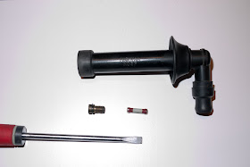 Tulpanhattu kiertäen pois tulpanjohdosta ja ruuvarilla ruuvaamaan tulpalle menevästä päästä messinkinen ruuvi irti. Ruuvin irrotessa sisältä putoaa myös resistori. Sekä saattaa pudota myös pitkähkö jousi. Itselläni jousi oli hyvin sisällä eikä pudonnut, enkä keksinyt yhtäkkiä kotivälineistä millä sitä olisin nypännyt, niin annoin jousen olla siellä. Tulpanhatut on toimineet hyvin, mutta eipä maksa vaivaa tarkistaa niiden sisällön kunto, kun se ottaa aikaa sen pari hassua minuuttia.
