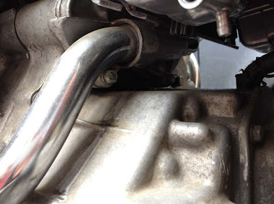 Kromiputki pitäisi olla suht helppo irroittaa. Nesteet pois ja kromiputken toinen pää pois syyläristä ja toinen pää nitkutetaan koneen kyljestä irti. Alkuperäinen O-rengas ei kuulemma ole O-rengas, vaan pikemminkin sellainen littana sormuksen mallinen pätkä kumia. Vähän kuin pyörän sisärenkaasta olisi leikattu pätkä. Mutta tämän on porukat korvanneet ihan nykyaikaisella O-renkaalla tai kahdella, sekä toiset lisäksi kuumakestosilikonilla. Sitten putki varovasti paikalleen suorassa kulmassa ja homma nippuun.