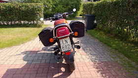Sen viimeisen lomapäivän kunniaksi heitetty 260km lenkki piti tehdä sopivalla varustuksella. Sivulaukut kiinni. Customin mukana tuli aikoinaan Heldin kankaiset sivulaukut. Jotain muovia ja vedenpitäviltä vaikuttivat. Helppo laittaa kiinni hetkessä. Ei laukkurautoja vaan satulan yli vaan ja koukuilla ja naruilla kiristetään sopiviin paikkoihin pyörässä. Aika siistit, tilavat ja kätevät käyttää, kun harvoin laukkuja tarvitsen enkä haluaisi laukkurautoja. Älkää kysykö mistä tällaisen laukun saa ostaa. En tiedä. En tiedä miten vanhakaan tämä on. Sen tiedän, että en luovu tästä laukusta ikinä :)