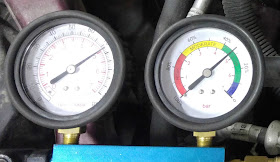 Sitten puristuspainemittari kiinni vasemmanpuoleiseen sylinteriin ja mittaus käyntiin.