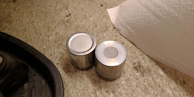 Jarrumännät edestä irti ja jotain huoltoa on ajan kanssa tehty, kun toinen jarrumäntä oli erilainen kuin toinen. Liekö aika ruostuttanut joskus toisen koloille. Teräsvillan kanssa kävin pinnat hieroen, ettei mitään skröpöä jäänyt pintoihin.