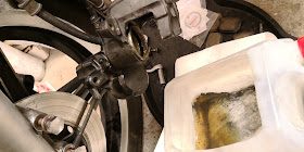 Iskunvaimentimien öljyt saivat myös lähteä vaihtoon. Vanha öljy olikin jo aivan mustaa. Koska lie vaihdettu viimeksi. Ei ainakaan ihan hetkeen. Tilalle laitoin Motulin SAE 10W haarukkaöljyä.