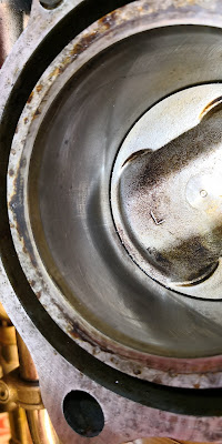 Tässä on kannet koneistettu ja muistaakseni sylinterit porattu pari vuotta sitten. Tarkalleen ottaen 2015 on viimeksi vasemman sylinterin kannentiiviste vaihdettu. Tämän johdosta kansi lähti hienosti irti noin neljän kumivasarapaukautuksen jälkeen. Kannenpultit lähtivät niin pienellä pyöräytyksellä auki, että epäilen, etteivät ne olleet ehkä ihan momentissaan.