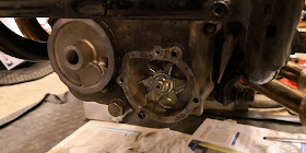 Tässä kun on nyt kannentiiviste vaihdettu ja samalla valutettu öljyt ja jäähdytysnesteet pois, niin päätin kokeilla käsin miltä tuntuu vesipumppu. Ja klappiahan siinä oli. Ihan kunnolla sormin tunnettavissa olevaa klappia, jota ei pitäisi olla yhtään, koska vesipumpun akseli on laakeroitu kahdella laakerilla, niin kaiken järjen mukaan sen pitäisi olla jämpti. Eli laakerit menossa veispumpussa.