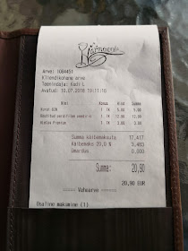 Syömään eksyttiin Tarton keskustaan johonkin sheriff's saloon nimiseen paikkaan. Tarjolla oli jos jonkinlaista, mutta päädyttiin vähän texmex tyyppisiin valintoihin. Mozzarellatikkua, juusto chili-tikkua, isoa beef-tortillaa ja jotain mitälie enchilladaa. Hinnat pääruuassa 8e luokkaa.