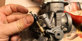 Tämän jälkeen saadaan ruuvattua kaasuttimet irti toisistaan ja päästään katsomaan kohoa ja neulaventtiiliä. Koho on mielenkiintoisesti kiinni U:n muotoisella raudalla, joka on vain painettu lujaa kaasuttimen lohkon reikään. Jottei riko mitään alumiinilohkosta, pitää tämä pienillä teräväkärkisillä pihdeillä nitkuttaa ulos. Tosi varovasti, mutta määrätietoisesti, niin se irtoaa kyllä.