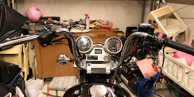 Orkkis stonga on tuollainen semi ape hanger tyyppinen tanko. Siihen nitkuteltiin sitten lämpökahvat kiinni. Yleensä olen ostanut niitä lämpökahvaelementtejä, jotka tulevat kahvatuppien alle. Siinä on aina se ongelma, että mihin laitat katkaisijan kiinni. Tällä kertaa ostin lämpökahvat mallia, jossa on katkaisija siinä itsessään ja lämpövastukset valettu kahvatuppiin sisään. Eli nitkutellaan vaan vasen tuppi paikalleen ja oikeanpuoleinen vaihdetaan kokonaan niin, että siihen tulee kiinni kaasuvaijerit.