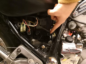 Jotenka päätin asentaa lämpökahvoille ihan oman virtajohdon releytettynä. Releelle löytyikin hyvä paikka tuosta mihin sormi osoittaa. Suoraan starttisolenoidin alla. Siinä on paikka vanhempien VN750 mallien RLU-yksikölle (Reserve Lightning Unit). RLU-yksikön kautta kulkee virta ajovalolle. Se tarkkailee valon vastusta ja jos ajossa esim. lyhyen hehkulanka menee poikki, se ohjaa virran pitkien hehkulangalle. Näin ei tarvitse ajaa pimeässä eteenpäin valon hajotessa. Samalla mittaristoon syttyy yksi merkkivalo kertomaan tilanteesta. Tässä vuosimallissa 1995 ei tätä ominaisuutta enää ollut.