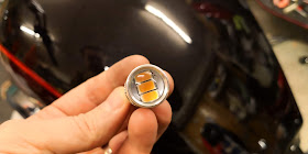 Kun taas itse nopeusmittarissa ja kierroslukumittarissa näytti olevan pienemmät T7 kantaiset polttimot. 7W taisi olla teho. Näiden kanta on niin pieni, että näihin ei oikein hyviä ympärisäteileviä ledejä löydy vielä tässä koossa. Joten jätin lasipolttimot myös mittareihin.