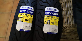 Takarengas on 14" ja eturengas 15". Hinnat näissä kokoluokissa eivät päätä huimaa. Pirelliltä olisi saanut noin 35-40e/kpl renkaat, mutta päädyin kuitenkin hieman kalliimpiin Michelinin City Grip renkaisiin, joita ylistetään aika paljon skootteripiireissä. Hyvä kuvio ja märkäpito. Hinta oli 50-55e/kpl luokkaa.