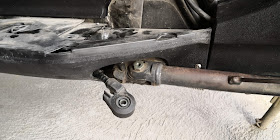 Sitten siirrytään etupäähän. Etu akseli on käytännössä pitkä kuusiokolopultti. Ihan turha oli yrittää avata sitä kuusiokoloavaimella. Piti käydä Motonetista hakemassa tuollainen pitkävartinen väännin (breaker bar) ja kuusiokolohylsysarja. Tällä sai narautettua helposti jumin auki ja akselin irti.