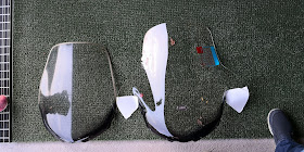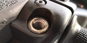 Siispä peilit irti ja miettimään uusia tilalle. No yllätys taas... kierteet ihan korkanneet toisella puolella. Päätin lopulta porata molemmat kierteet ja korvata helicoileilla. Jälleen pehmeä metalli helppo työstää. Ainut että, peilien kierteet yleensä ovat M10 halkaisija ja 1.25mm kierrenousulla. Helicoilit taas olivat M10 ja 1.5mm kierrenousulla. Onneksi hyllyssä sattui olemaan vanhat peiliadapterit, jotka olivat juurikin niin, että M10 ja 1.5mm nousulla se uros puoli, joka ruuvattiin tuonne helicoil-kierteisiin ja adapterin naaraspuolella ne peiliin tulevat M10 1.25mm nousulla olevat kolot. Ongelma ratkaistu.