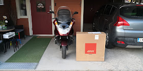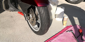 Apriliassa oli takarengas kulunut melko sileäksi. Etusessa oli vielä pikkuisen pintaa. Mutta syksy ja sateet tulossa ja tarkoitus tällä ajaa työmatkoja ihan pakkasten tuloon asti, niin parasta alle märkäpitoa ajatellen.