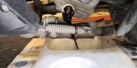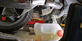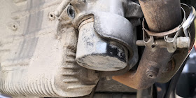 Tässä vielä eri kuvakulmasta, miten tuo öljynsuodatin tuolla on kiinni ruuvattuna pakoputken takana.