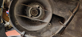 Sihdin voi irroittaa kolmella ruuvilla ja löytyy se mutteri, josta voi pyörittää moottoria. Tuo mutterin ympärillä oleva muovisuppilo lähtee vielä vetämällä pois, niin helpottuu homma entisestään.