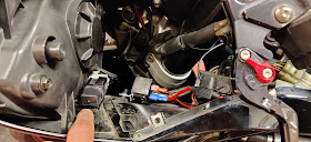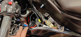 Sitten asenneltiin johdotukset releen avulla kytkinkahvan alapuolelle, joihin kytkettiin lämpökahvaelementit, sekä usb-laturi kännykkää tai navigaattoria varten.
