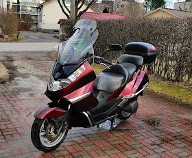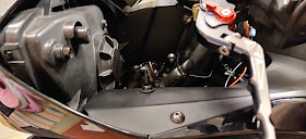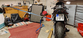 Annettiin pyörän olla ainoalla sivujalallaan ja täytettiin öljyt sisään. Ihmeteltiin kun mittatikku ei kastunut. No lisää öljyä sisään ja lopulta mittatikkua paikalla käyttämällä (ruuvaamatta kiinni) saatiin öljynpinta mittatikun ylärajaan.