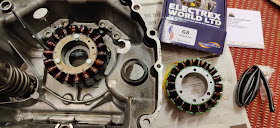 Sitten vaan etupää nippuun ja takalohkon ja staattorin kimppuun. Uudeksi staattoriksi valitsin Electrexin staattorin. Hinta oli jotain 136 euroa posteineen. Puolta halvemmalla saa kiinasta staattoreita, mutta sanoisin että ei kannata säästää tässä kohtaa. Koko moottorin irroitus ja avaaminen on niin iso operaatio, että et halua tehdä sitä kuitenkaan pian uudestaan. Joten laadukkaita staattoreita vain paikalleen. Itse olen electrexin staattoreita käyttänyt näissä ja hyvin ovat pelanneet. Briteissä valmistettuja staattoreita.