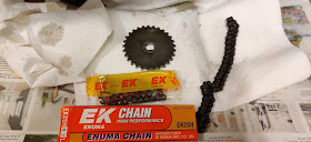 Kyllähän siinä löysää oli jo. Sitä pystyy hieman kiristämään tuosta ratasta siirtämällä, mutta uusi ketju oli tiukempi. Se paikalleen vaan suosiolla.