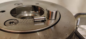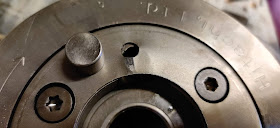 Yks holkki oli jousen kera jäänyt jumiin magneeton sisälle koloonsa. Sikäli ikävä paikka, ettei sitä tuolta saa pois mitenkään. Yritin naputella, koputella, vasaroida kuminuijalla ja kaikkea, mutta se on kuin liimattu. Tämän johdosta yksi starttikehän kolmesta rullasta ei ole ollut mukana starttaamassa moottoria ja moottori ei ole kunnolla aina napannut kiinni ja lähtenyt pyörimään.