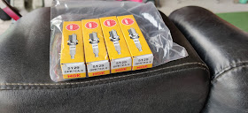 Ensimmäisenä uudet sytytystulpat, koska vanhoista ei tiennyt koska niitä on vaihdettu ja niistä näki että ei ne ihan tuoreet ollet. Useamman vuoden vanhat. Motonetista vaan uutta ohjekirjan mukaista tulppaa kiinni. NGK DPR7EA-9 ja 4 kappalta. Kaksi per sylinteri.