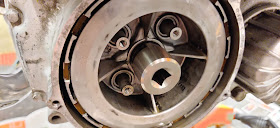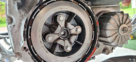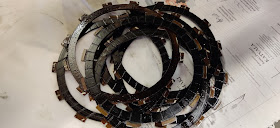 Kytkinpakan läpikäynti ja ei ihme, että luisti. Kahdesta kytkinpalasta puuttui kokonaan toiselta puolelta kytkinpalat. Vaihdoin samalla niitä vasten olevat metalliset kytkinlevyt, joissa oli hieman tummumaa kuumuudesta ja luistamisesta. Saattoivat olla jo kieroutuneet hieman.